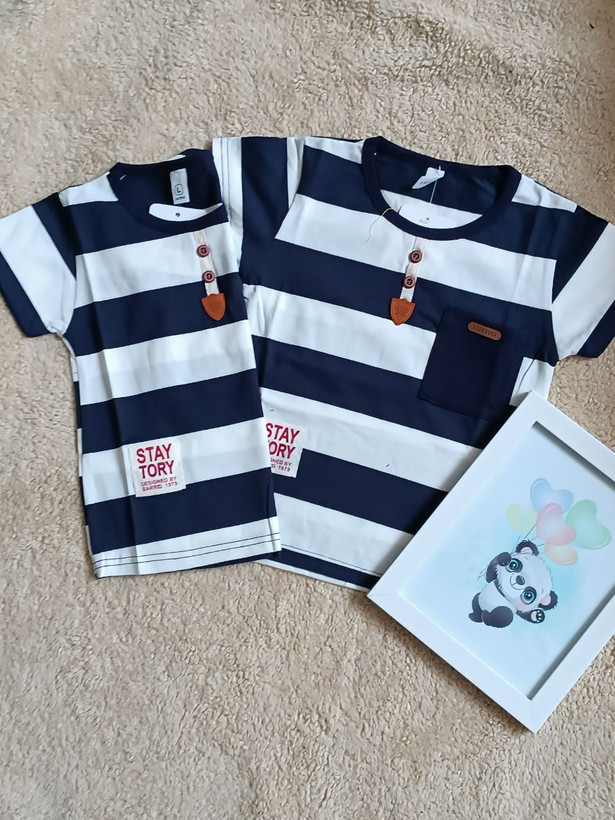 تیشرت تک راه راه سرمه ای و سفید پسرانه طرح دو دکمه جنس نخ پنبه لاکرادار